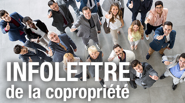 L’infolettre mensuelle de la copropriété est distribuée les 1ers de chaque mois. Elle est dédiée au grand public et à tous ceux qui choisissent et recherche des solutions pour vivre en en harmonie tout en créant de la valeur pour leur copropriété. L’infolettre permet à CondoConseils et l’Institut de la copropriété du Québec de vous informer sur les événements et formations à venir, vous propose des articles en vedettes publiés dans le magazine Copropriété Plus et vous partage des nouvelles importantes utiles pour la bonne gestion de vos copropriétés. Tous les administrateurs des syndicats de copropriété membres de CondoConseils et les représentants des fournisseurs accrédités reçoivent l’infolettre mensuellement.
